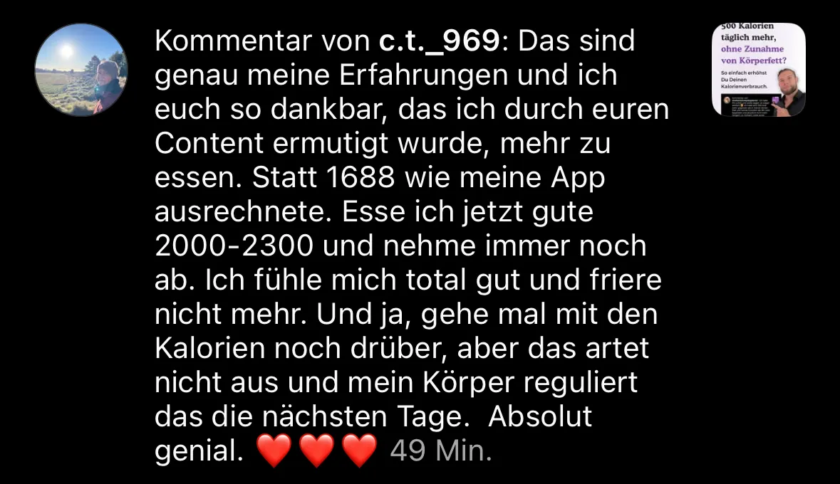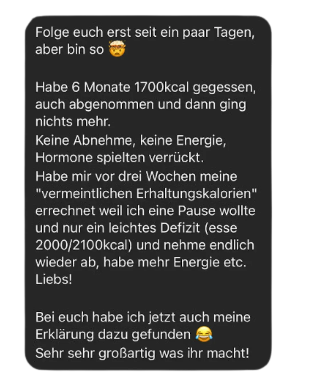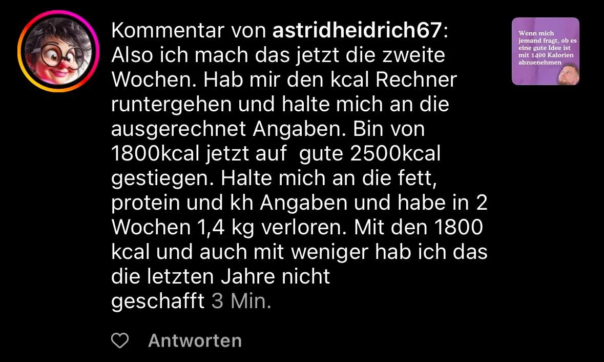 „Ich habe mit 1500 Kalorien kein Gewicht verloren. Jetzt esse ich 2400 Kalorien und habe bereits 3 Kilogramm abgenommen.“